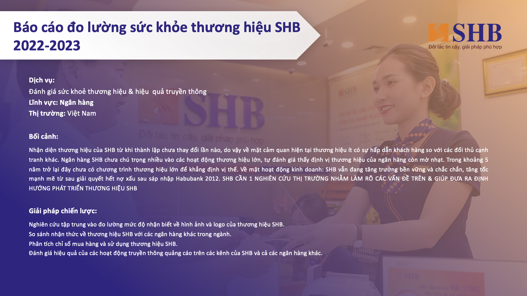 Nhận diện thương hiệu của SHB từ khi thành lập chưa thay đổi lần nào, do vậy về mặt cảm quan hiện tại thương hiệu ít có sự hấp dẫn khách hàng so với các đối thủ cạnh tranh khác. Ngân hàng SHB chưa chú trọng nhiều vào các hoạt động thương hiệu lớn, tự đánh giá thấy định vị thương hiệu của ngân hàng còn mờ nhạt. Trong khoảng 5 năm trở lại đây chưa có chương trình thương hiệu lớn để khẳng định vị thế. Về mặt hoạt động kinh doanh: SHB vẫn đang tăng trưởng bền vững và chắc chắn, tăng tốc mạnh mẽ từ sau giải quyết hết nợ xấu sau sáp nhập Habubank 2012. SHB CẦN 1 NGHIÊN CỨU THỊ TRƯỜNG NHẰM LÀM RÕ CÁC VẤN ĐỀ TRÊN & GIÚP ĐƯA RA ĐỊNH HƯỚNG PHÁT TRIỂN THƯƠNG HIỆU SHB