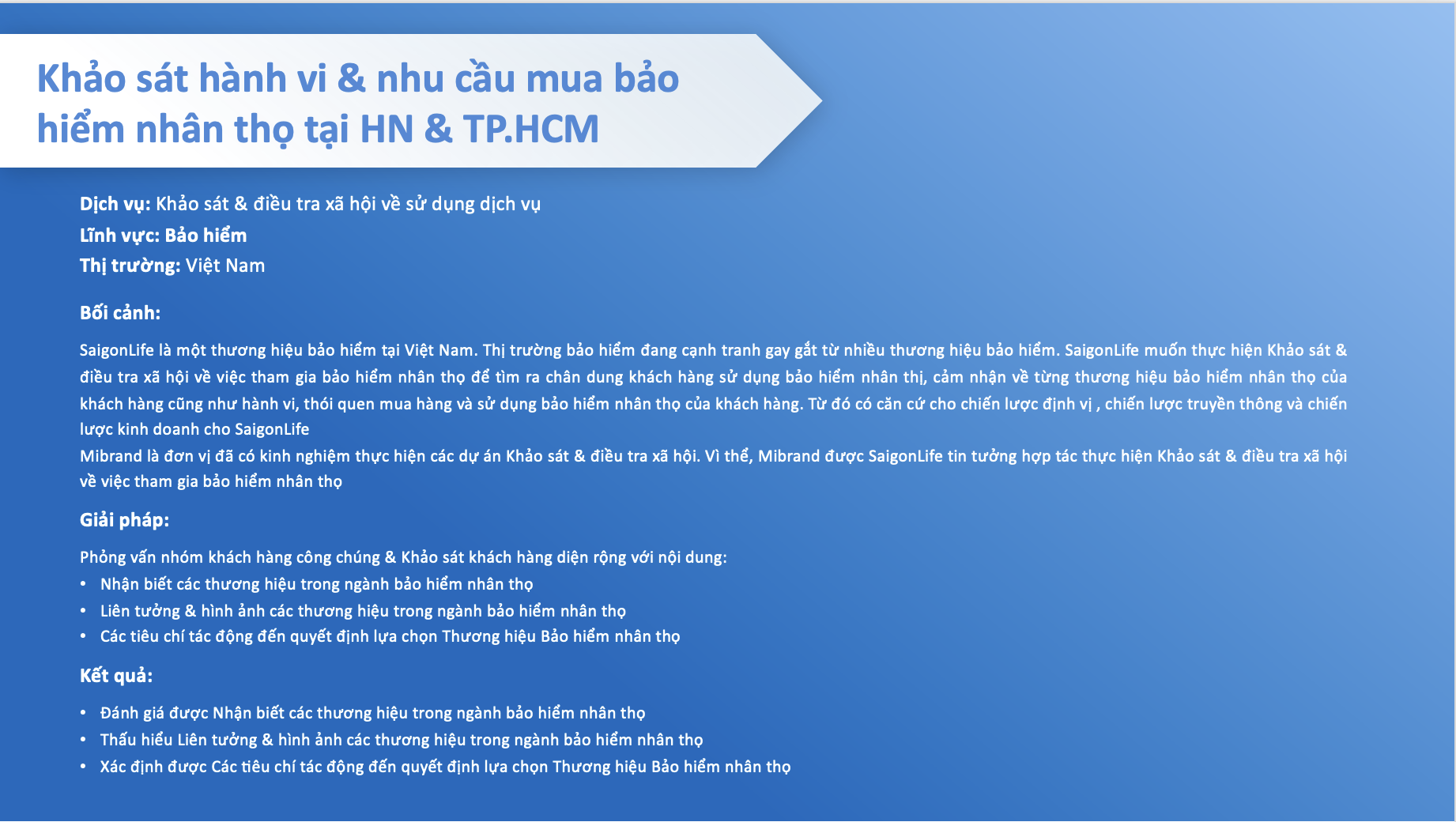 Mibrand là đơn vị đã có kinh nghiệm thực hiện các dự án Khảo sát & điều tra xã hội. Vì thế, Mibrand được SaigonLife tin tưởng hợp tác thực hiện Khảo sát & điều tra xã hội về việc tham gia bảo hiểm nhân thọ