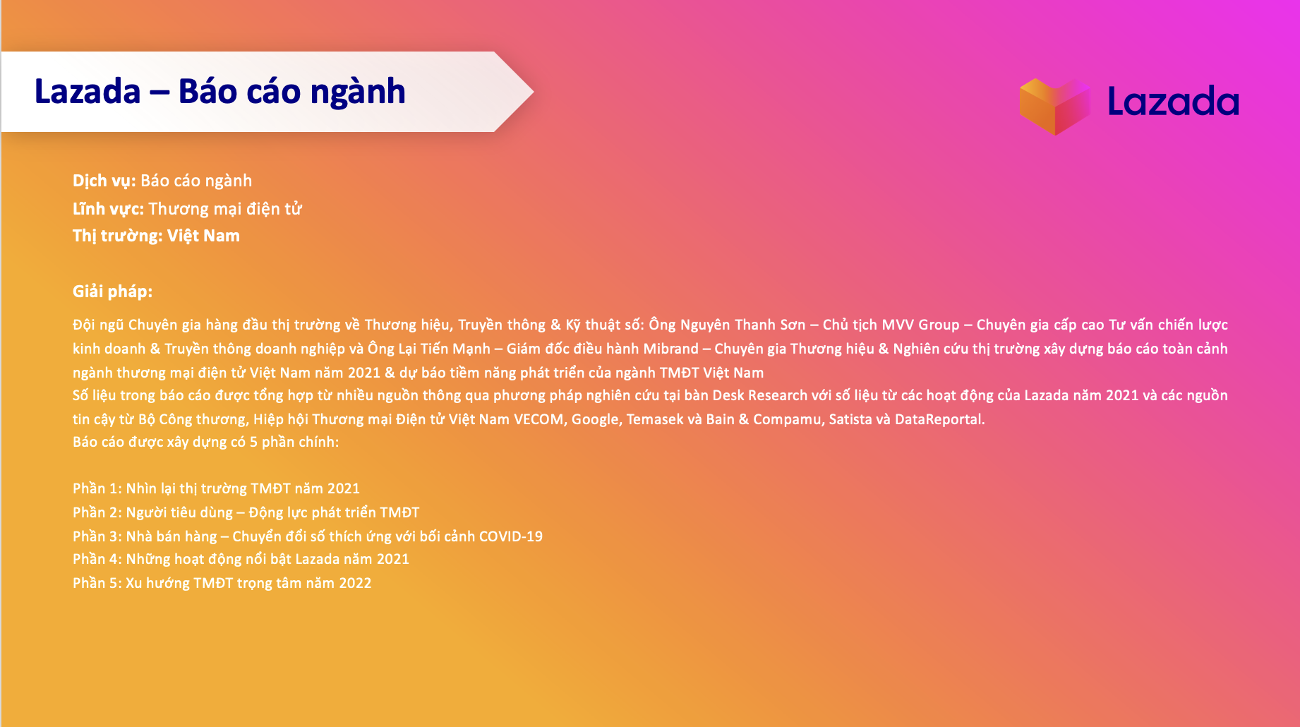 Đội ngũ Chuyên gia hàng đầu thị trường về Thương hiệu, Truyền thông & Kỹ thuật số: Ông Nguyên Thanh Sơn – Chủ tịch MVV Group – Chuyên gia cấp cao Tư vấn chiến lược kinh doanh & Truyền thông doanh nghiệp và Ông Lại Tiến Mạnh – Giám đốc điều hành Mibrand – Chuyên gia Thương hiệu & Nghiên cứu thị trường xây dựng báo cáo toàn cảnh ngành thương mại điện tử Việt Nam năm 2021 & dự báo tiềm năng phát triển của ngành TMĐT Việt Nam