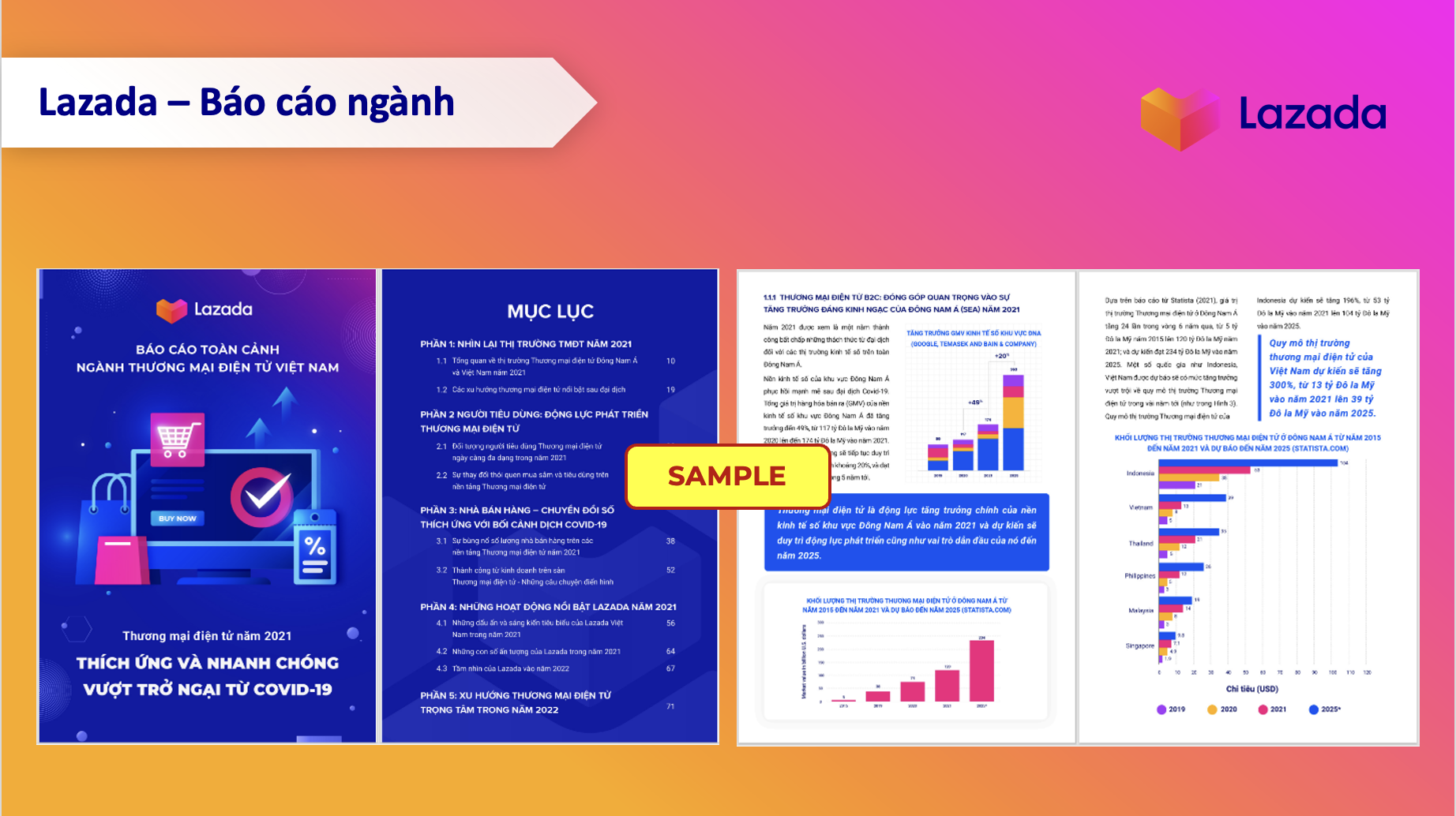 Số liệu trong báo cáo được tổng hợp từ nhiều nguồn thông qua phương pháp nghiên cứu tại bàn Desk Research với số liệu từ các hoạt động của Lazada năm 2021 và các nguồn tin cậy từ Bộ Công thương, Hiệp hội Thương mại Điện tử Việt Nam VECOM, Google, Temasek và Bain & Compamu, Satista và DataReportal.