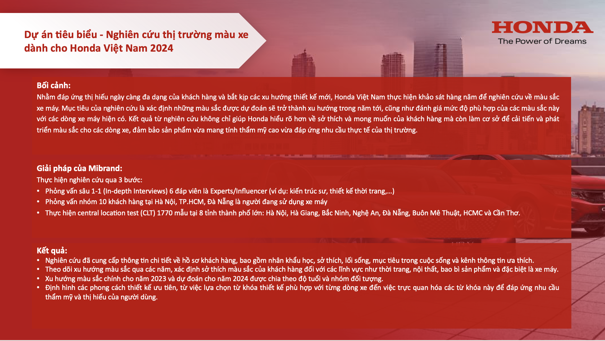 • Nhằm đáp ứng thị hiếu ngày càng đa dạng của khách hàng và bắt kịp các xu hướng thiết kế mới, Honda Việt Nam thực hiện khảo sát hàng năm để nghiên cứu về màu sắc xe máy. Mục tiêu của nghiên cứu là xác định những màu sắc được dự đoán sẽ trở thành xu hướng trong năm tới, cũng như đánh giá mức độ phù hợp của các màu sắc này với các dòng xe máy hiện có. Kết quả từ nghiên cứu không chỉ giúp Honda hiểu rõ hơn về sở thích và mong muốn của khách hàng mà còn làm cơ sở để cải tiến và phát triển màu sắc cho các dòng xe, đảm bảo sản phẩm vừa mang tính thẩm mỹ cao vừa đáp ứng nhu cầu thực tế của thị trường.