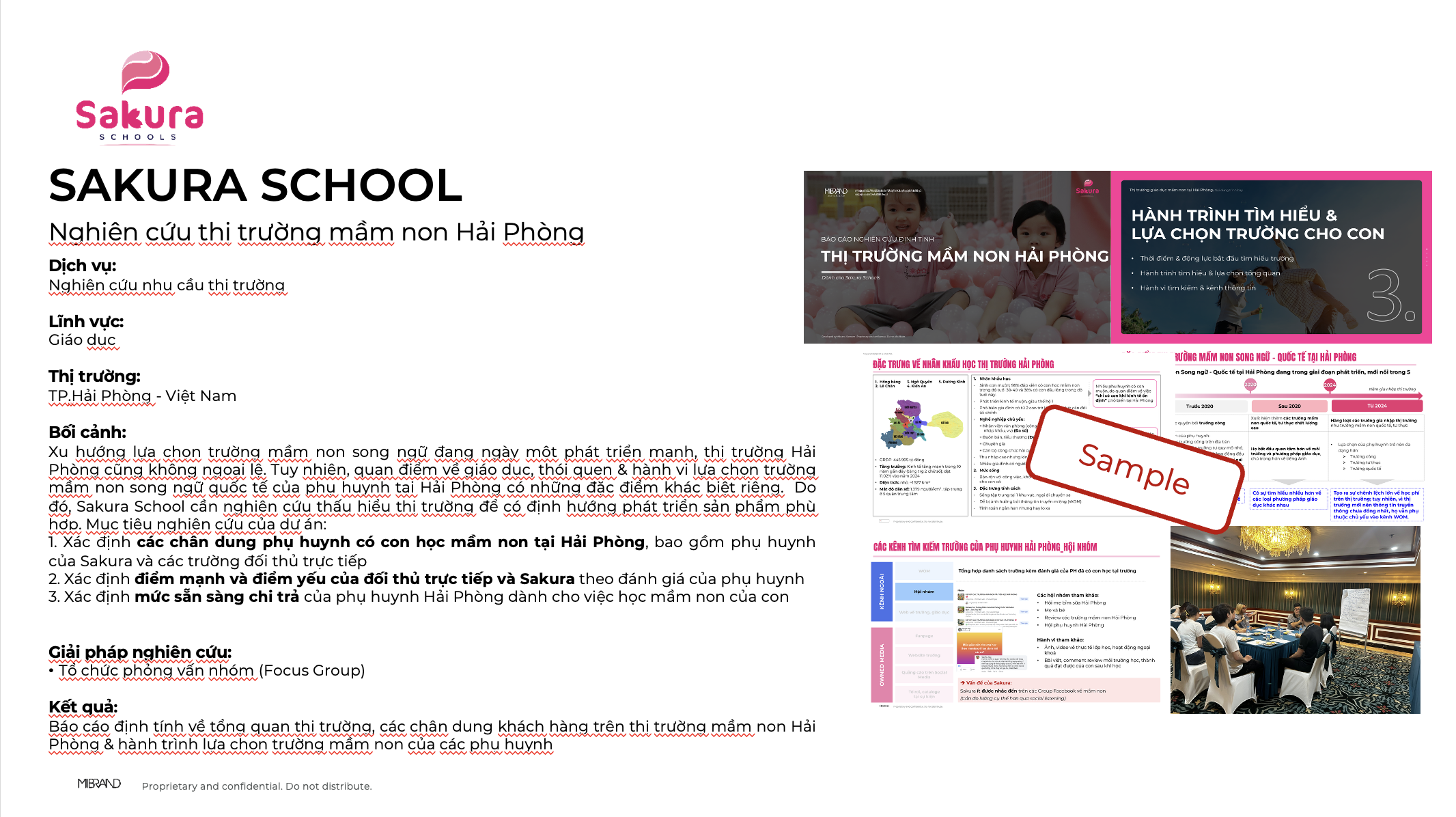 Xu hướng lựa chọn trường mầm non song ngữ đang ngày một phát triển mạnh, thị trường Hải Phòng cũng không ngoại lệ. Tuy nhiên, quan điểm về giáo dục, thói quen & hành vi lựa chọn trường mầm non song ngữ quốc tế của phụ huynh tại Hải Phòng có những đặc điểm khác biệt riêng. Do đó, Sakura School cần nghiên cứu thấu hiểu thị trường để có định hướng phát triển sản phẩm phù hợp. Mục tiêu nghiên cứu của dự án: