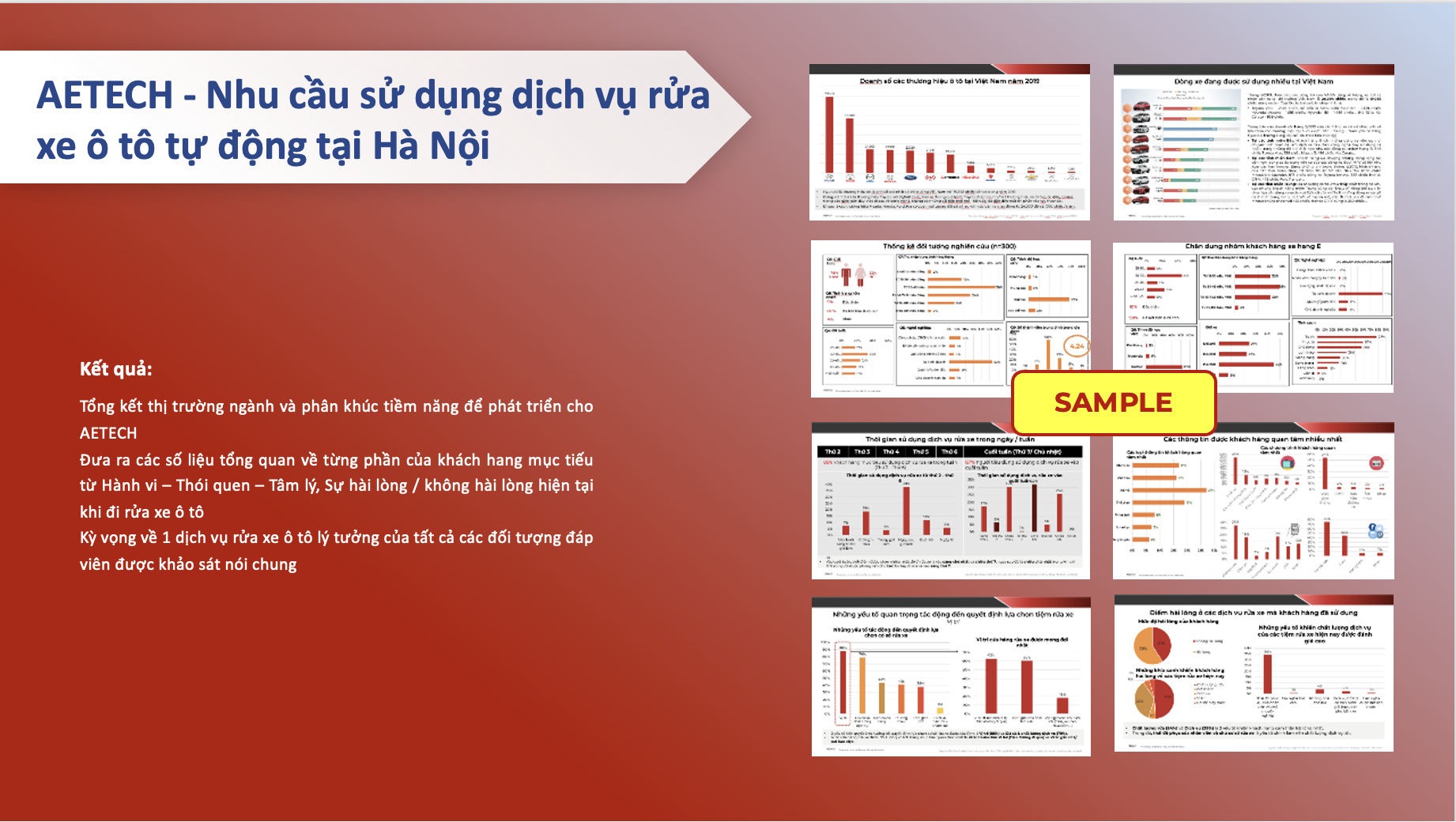 Đưa ra các số liệu tổng quan về từng phần của khách hang mục tiếu từ Hành vi – Thói quen – Tâm lý, Sự hài lòng / không hài lòng hiện tại khi đi rửa xe ô tô