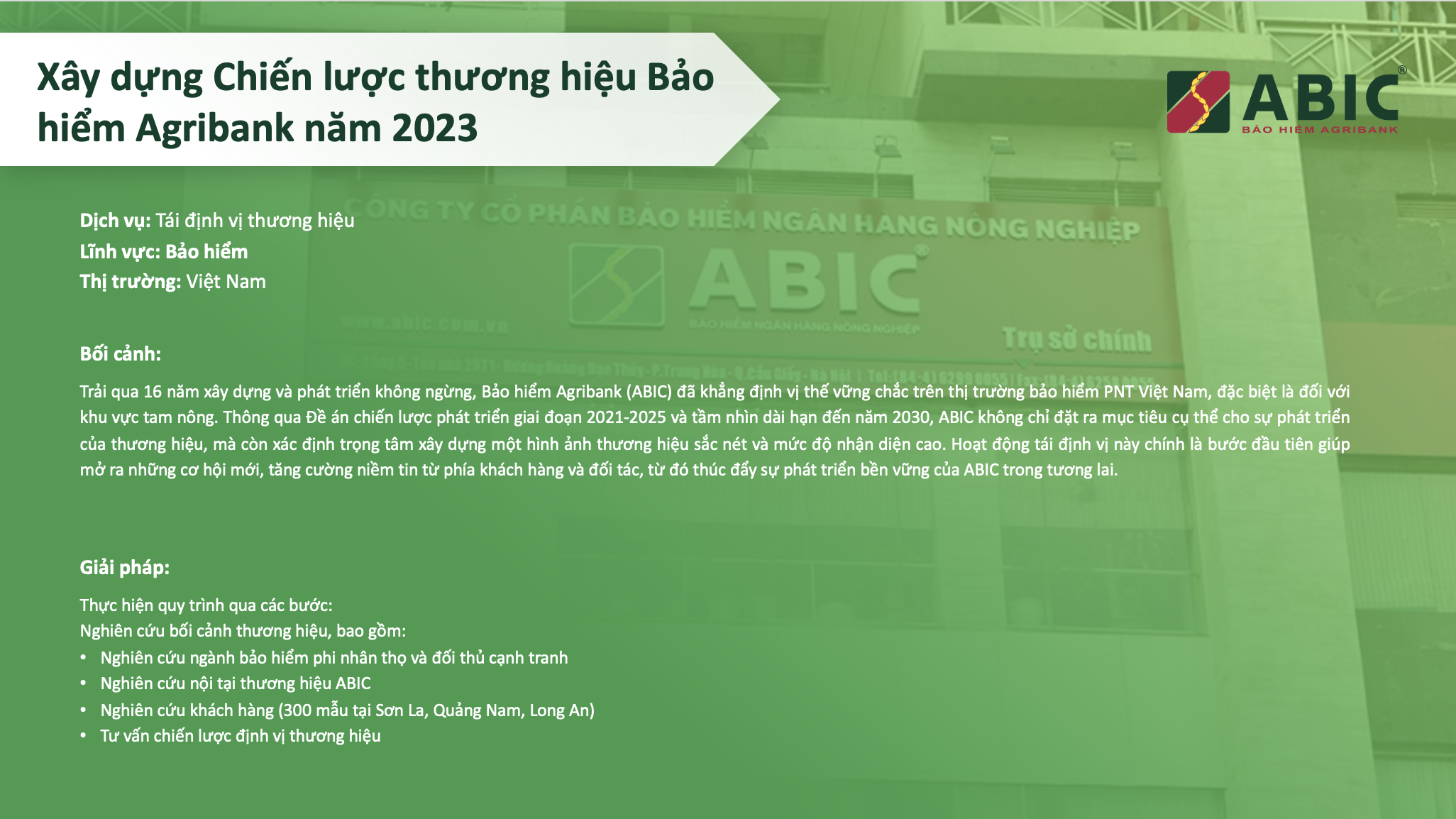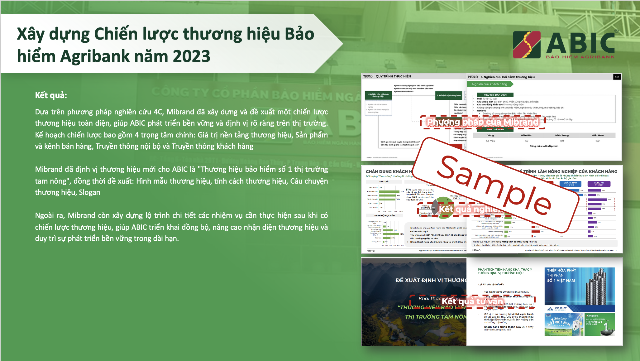 • Mibrand đã định vị thương hiệu mới cho ABIC là “Thương hiệu bảo hiểm số 1 thị trường tam nông”, đồng thời đề xuất: Hình mẫu thương hiệu, tính cách thương hiệu, Câu chuyện thương hiệu, Slogan